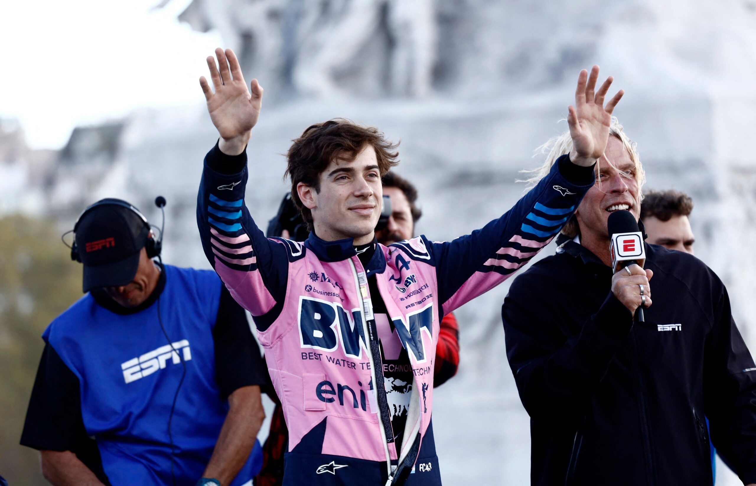 Franco Colapinto saluda al público en el cierre del Road Show en Buenos Aires (REUTERS/Alessia Maccioni)