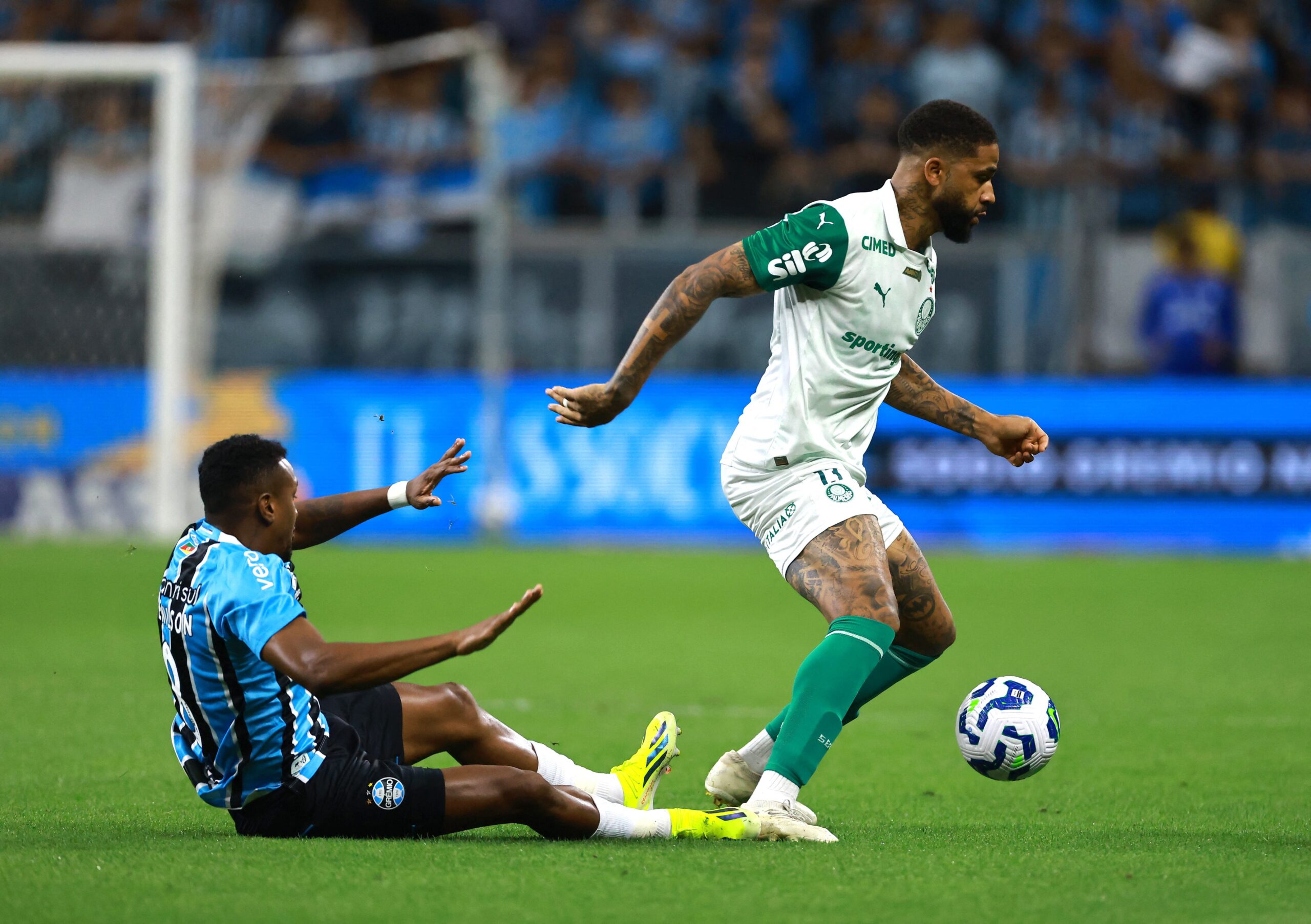 Micael en medio de una disputa de pelota con el jugador del Gremio, Edenilson (Crédito: Reuters/Diego Vara)