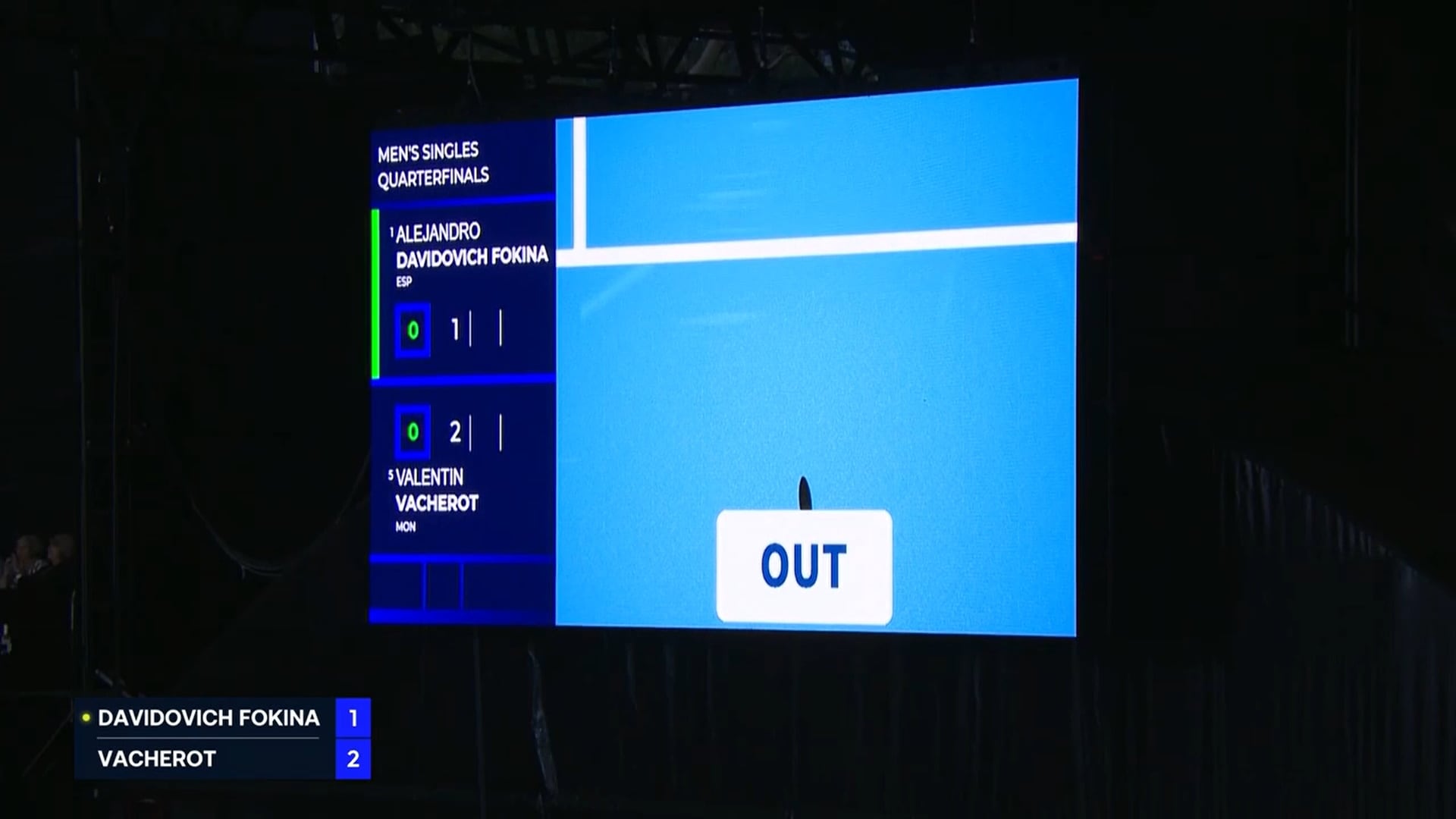 En el desarrollo del primer set, con el marcador 2-1 a favor de Vacherot, Davidovich falló su primer servicio y expresó dudas respecto a la decisión del juez, solicitando la revisión del pique de la bola. Mientras las imágenes demoraban en aparecer en las pantallas, el umpire realizó gestos claros para indicar que el saque había salido considerablemente largo. La reacción del español, que no terminaba de aceptar la indicación, sumó expectación entre los asistentes.