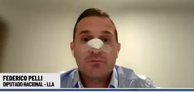 El diputado nacional por LLA, Federico Pelli de Tucumán, brindó una entrevista virtual con un vendaje en la nariz. (Captura LN+)