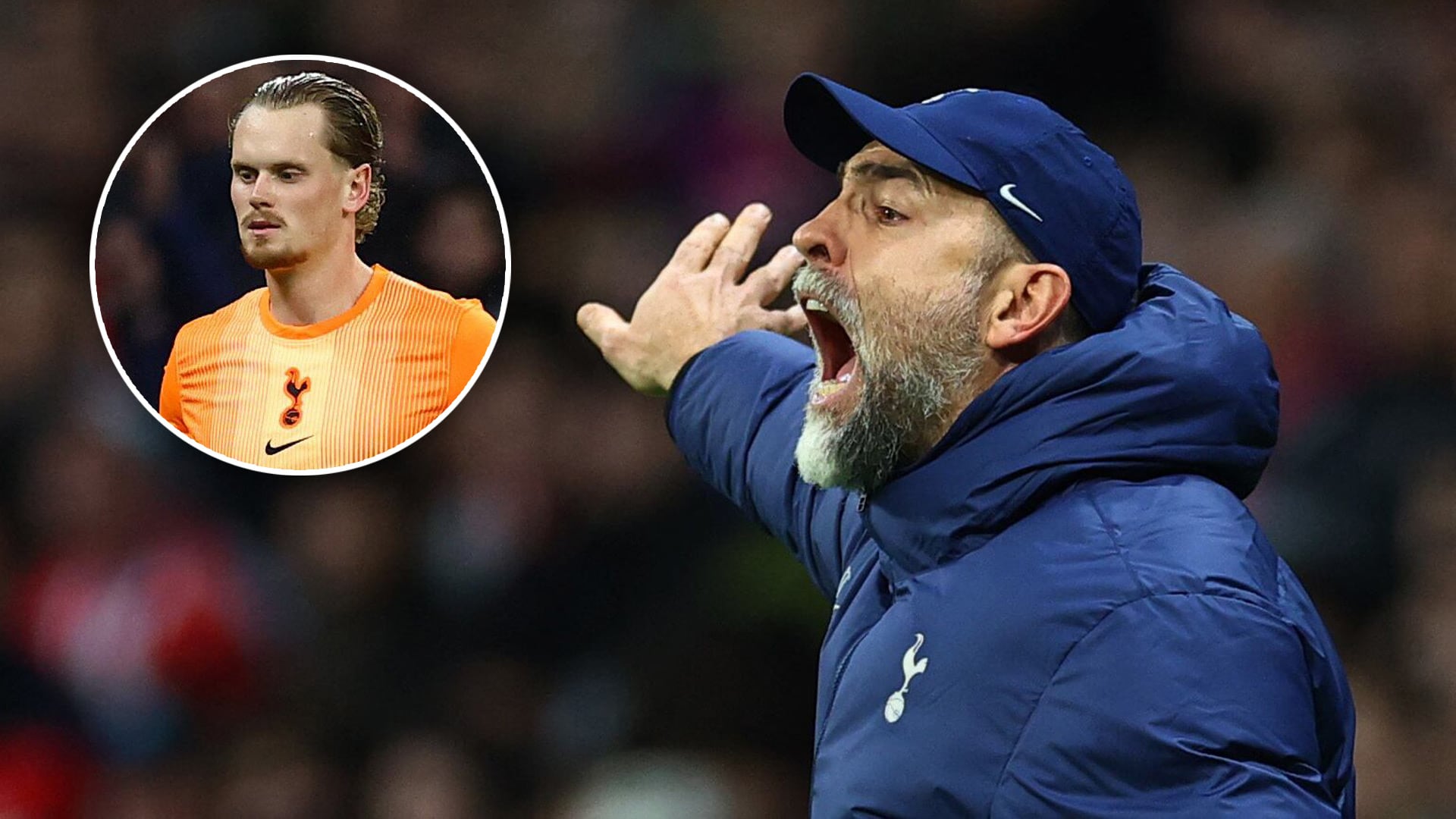 El director técnico Igor Tudor gesticula en el banquillo del Tottenham mientras se ve al arquero Antonín Kinský en un recuadro.