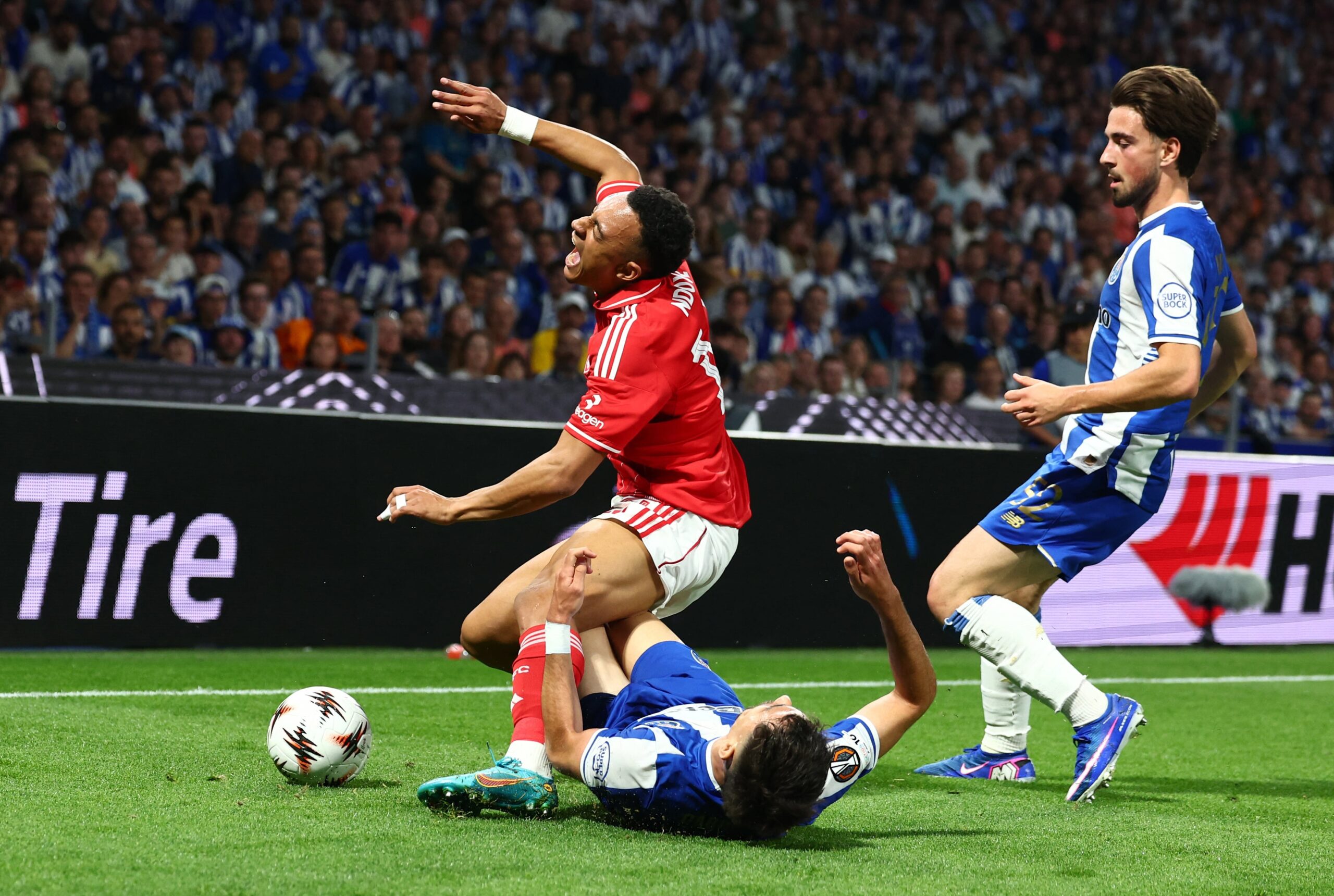 La jugada en la que Martim Fernandes recibió un golpe en su tobillo y tuvo que marcharse lesionado (REUTERS/Pedro Nunes)