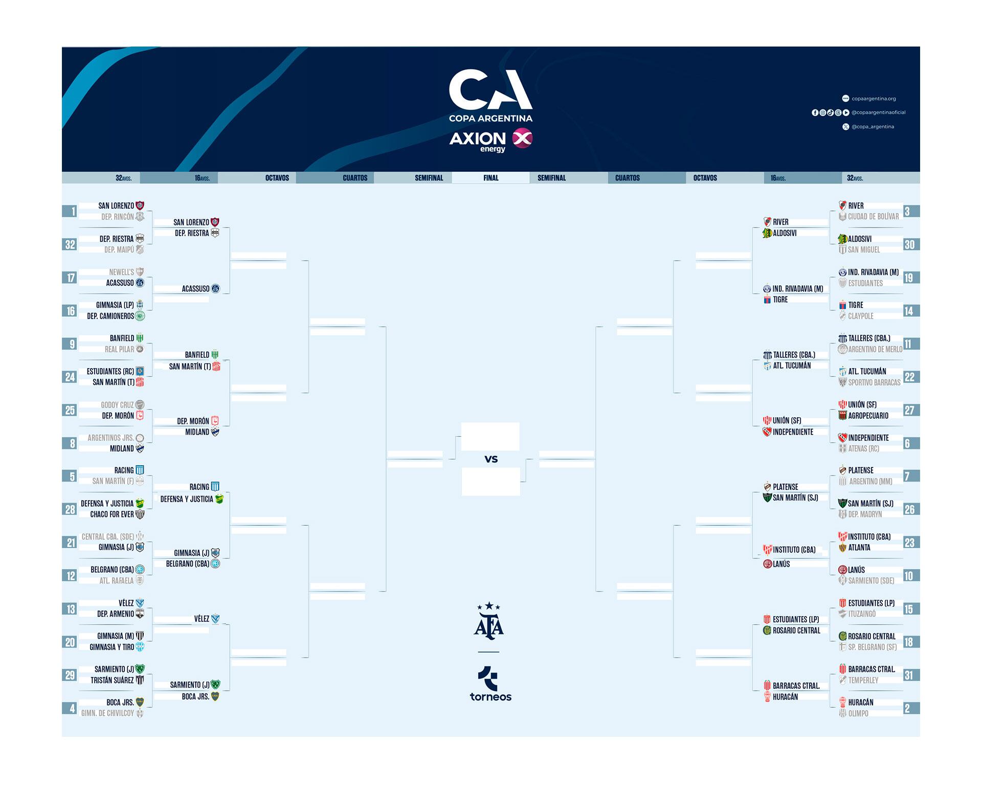 Sarmiento se verá las caras con Boca Juniors, que dejó en el camino a Gimnasia y Esgrima de Chivilcoy por 2-0, con un doblete de Adam Bareiro en su debut con la camiseta del Xeneize en el estadio Padre Ernesto Martearena de Salta. El equipo que se clasifique a los octavos de final esperará por quien se imponga en la llave entre el ganador de Gimnasia de Mendoza-Gimnasia y Tiro de Salta (jugarán el próximo miércoles) y Vélez, que eliminó a Armenio.